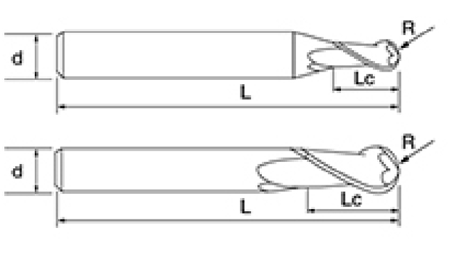 | No. | reiámetro D | Ángulo R R | longiture de la flauta lc | Longitud total L | Diámetro del vástago d | Recuento de cuchillas f |