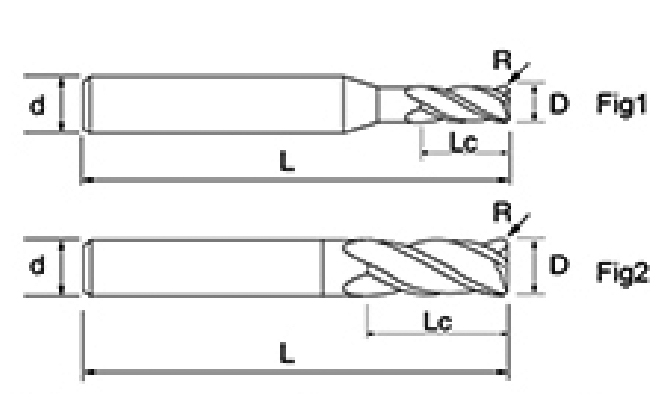 | No. | reiámetro D | Ángulo R R | longiture de la flauta lc | Longitud total L | Diámetro del vástago d | Recuento de cuchillas f |