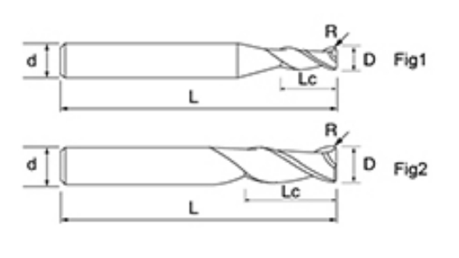 | No. | reiámetro D | Ángulo R R | longiture de la flauta lc | Longitud total L | Diámetro del vástago d | Recuento de cuchillas f |