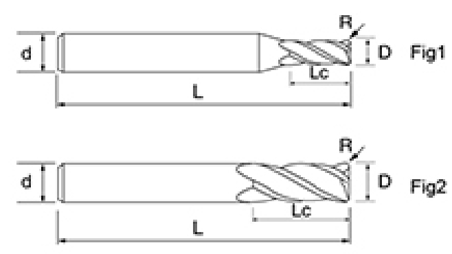 | No. | reiámetro D | Ángulo R R | longiture de la flauta lc | Longitud total L | Diámetro del vástago d | Recuento de cuchillas f |