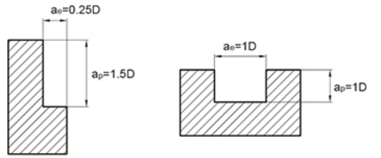 1. La tabla anterior se basa en los valores de referencia para el fresado lateral. Las condiciones de corte para el fresado de ranuras se basan en el 70 % de la velocidad de corte y el 50 % de la velocidad de avance en la tabla anterior.