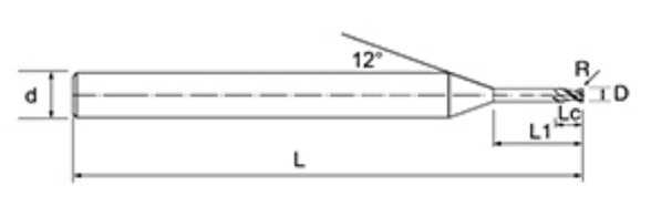 | No. | reiámetro D | Ángulo R R | longiture de la flauta lc | Longitud efectiva L1 | Longitud total L | Diámetro del vástago d | Recuento de cuchillas f |